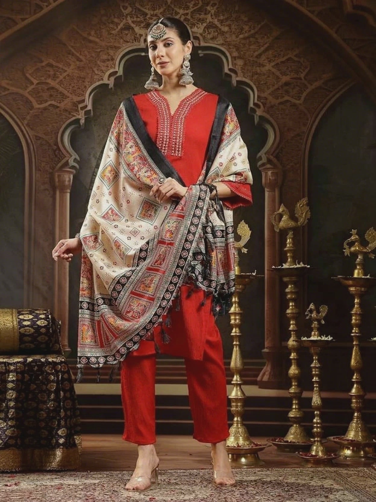 Red Digital Printed Kaftan With Silver Stone Embroidery