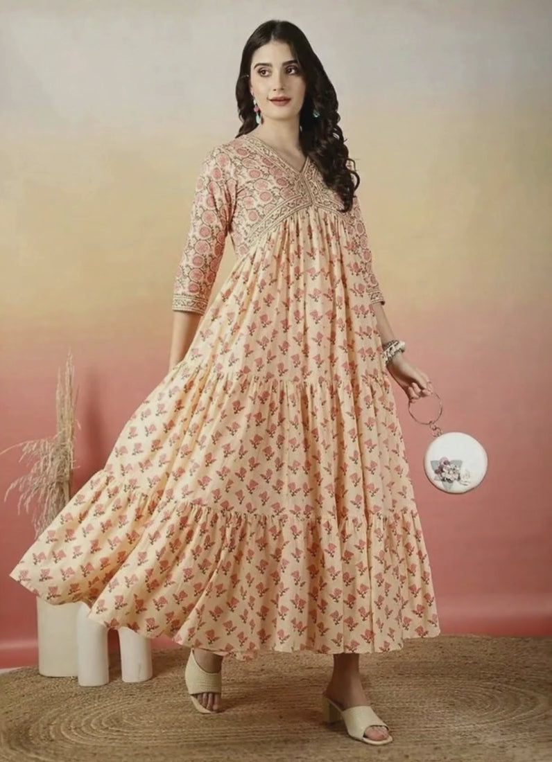 This beautiful beige cotton dress comes with V-neckline, with 3/4th sleeves and print all over it.