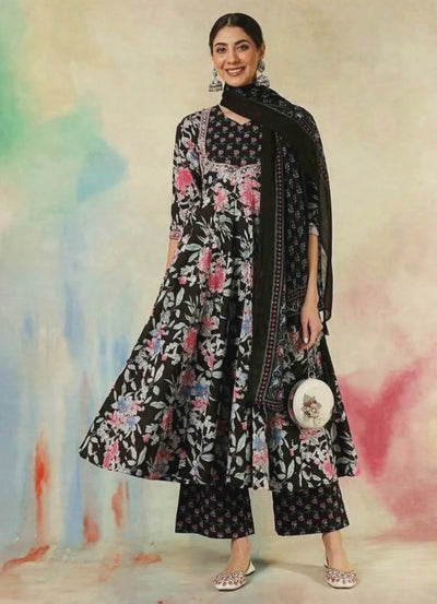 This beautiful black bias cut suit is a must have for every festive wardrobe. The top comes in cotton fabric with V- neckline with 3/4th sleeves . It comes paired with matching cotton pants and cotton printed dupatta.