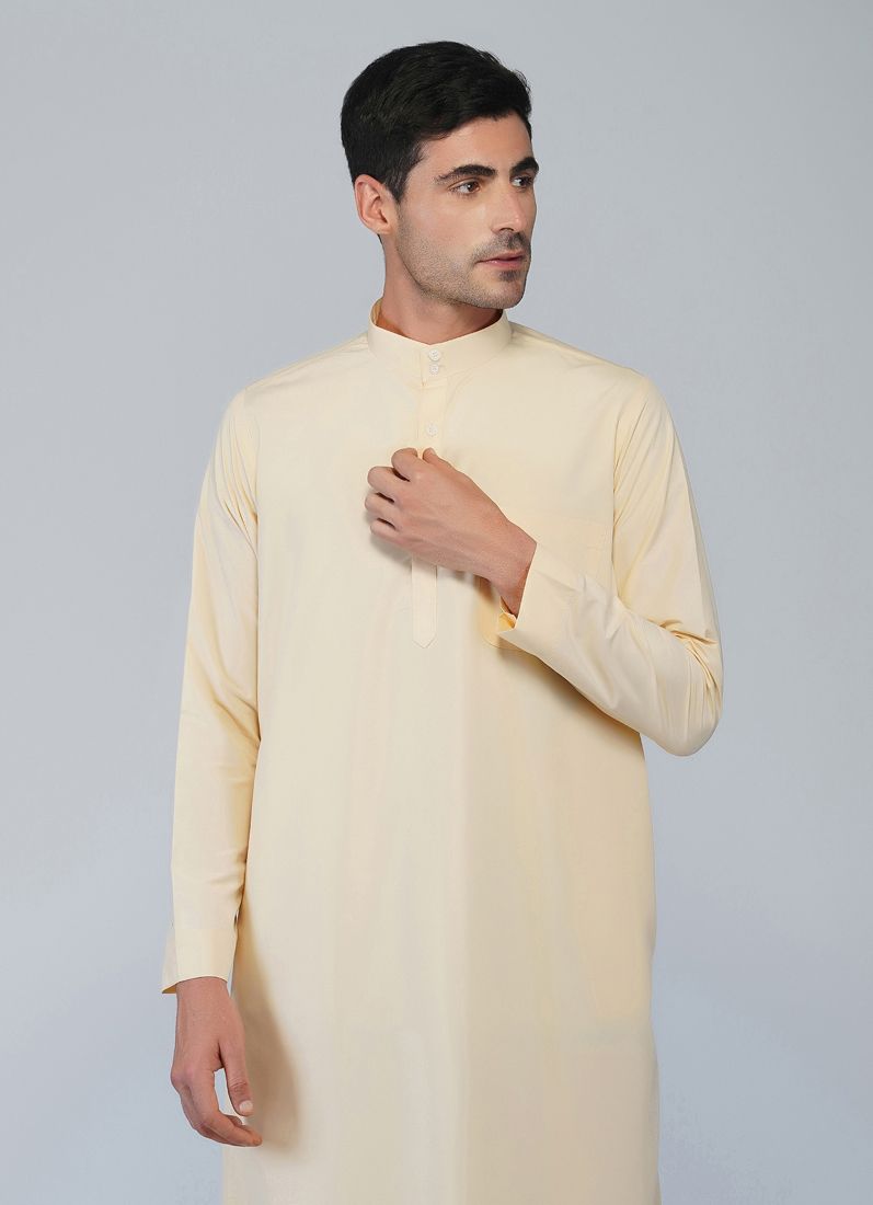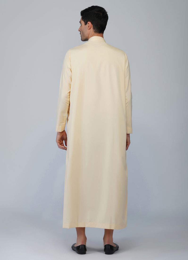 Traditional mens's wear with sand gold juba having long sleeves with piping on its sleeve hemline and neheru collar neckline in cotton polyester fabric.