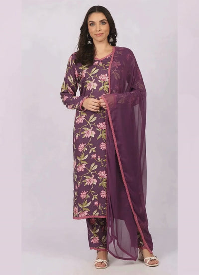 Effortlessly elegant and perfect for festive, this purple rayon straight cut suit set features a V neckline and 22" sleeves, beautifully detailed with pink thin crochet on the neckline, sleeves & kurta hemline. Paired with matching fabric trouser and flowy chiffion dupatta with 4 side crochet lace, this ensemble is ideal for festive gatherings, casual outings. or refined daywear.