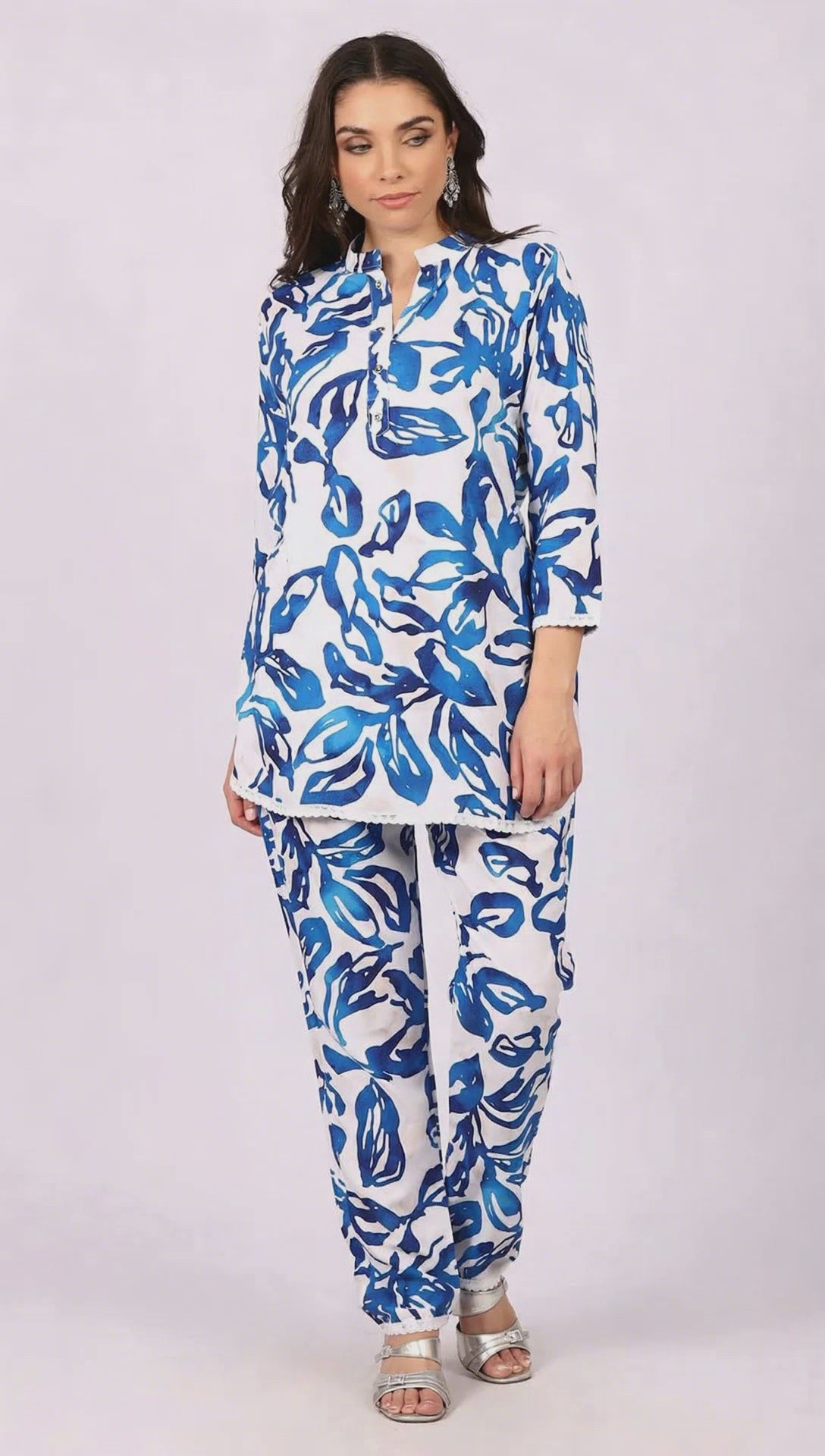 Effortlessly elegant and perfect for festive, this white rayon co-ord set features a band collar neckline and 22" sleeves, beautifully detailed with buttons on the neckline. Paired with matching fabric trouser, this ensemble is ideal for festive gatherings, casual outings. or refined daywear.